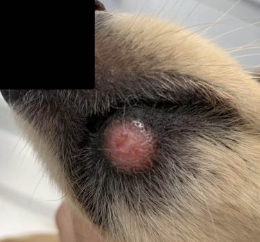 症例は下顎正中の先端に円形の脱毛した紅斑を伴う腫瘤が形成されていた。