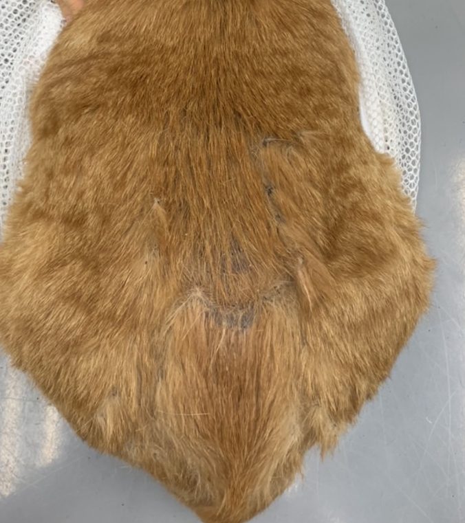 毛をかき分けると、細かいノミの糞と、ノミの成虫が確認されたため、ノミアレルギー性皮膚炎と診断した。