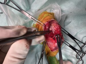 手術はまず皮膚を切開し、膝関節包を丁寧に開いて内部を確認しました。断裂していた前十字靭帯の残存組織は適切に除去し、内側半月板の損傷の有無を確認したうえで必要な処置を行いました。