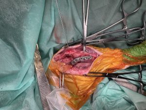 続いてTPLOに移り、ラウンドソーを用いて脛骨を計画した位置で骨切りし、脛骨高平部を適切な角度に回転させました。その後、専用のTPLOプレートで骨片を確実に固定し、骨の安定性を確保しました。最後に関節包・皮下組織・皮膚を順に閉鎖し、手術を終了しました。