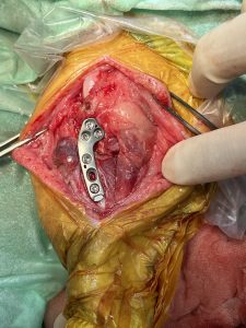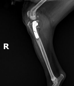 TPLOプレートを設置し、スクリューで固定して手術を終了した。