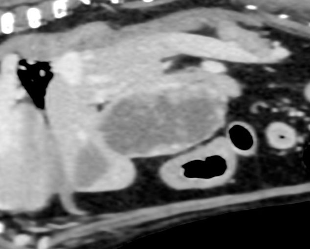腫瘍性病変が認められた場合、通常では確認されない血管が申請されていることが多いため、術中の出血リスクを軽減するために術前の評価としてCT検査が有用である。また、肝臓にはもともと大型の血管が付属しているため、正常にも存在する大血管とのかかわりも明らかになることは手術計画を立てる上でも重要となる。