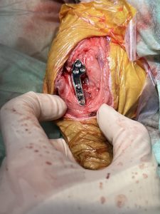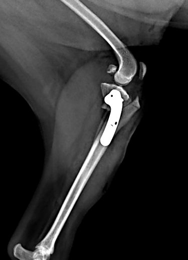 TPLOプレートを装着し、スクリューでしっかりと固定して手術を終了しました。