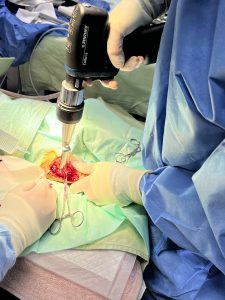 続いて、専用のラウンドソーを用いて脛骨を計画どおりに骨切りし、