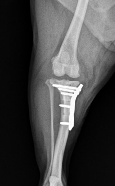 骨片を整復後、TPLOプレートを設置し、スクリューで固定した。