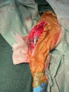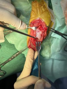 関節包を開放し、関節内を観察したところ、前十字靭帯の完全断裂を確認した。