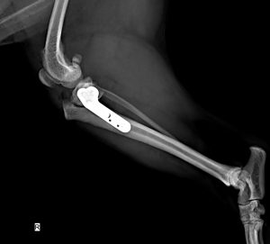 治療は外科手術を実施しました。関節包を開いて内部を確認し、断裂していた前十字靭帯を除去するとともに、損傷していた内側半月板の処理を行いました。関節内を洗浄した後、脛骨の角度を調整する**脛骨高平部水平化術(TPLO)**を実施し、専用のプレートで骨を固定して手術を終了しました。
