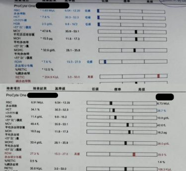 レントゲン検査では明らかな異常を認めなかったが、血液検査で重度の貧血(HCT:7.8%)を認めた。また、腹部超音波検査では消化管には明らかな異常は認めなかったが、脾臓が肥厚している所見が認められた。
