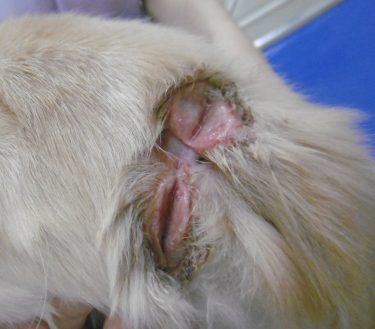 身体検査所見で、左耳、耳根部に皮膚の裂開が認められた。