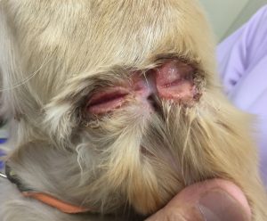 輪ゴムは家族にお子様がいるご家庭で起こしやすい外傷となります。輪ゴムがまかれた位置により、首や頭部に今回の写真のような傷が全周性に認められます。輪ゴムを除去し、必要に応じて外科処置を行えば予後は良好ですが、頸部にまかれた輪ゴムが重要な血管を侵してしまった場合には注意が必要です。