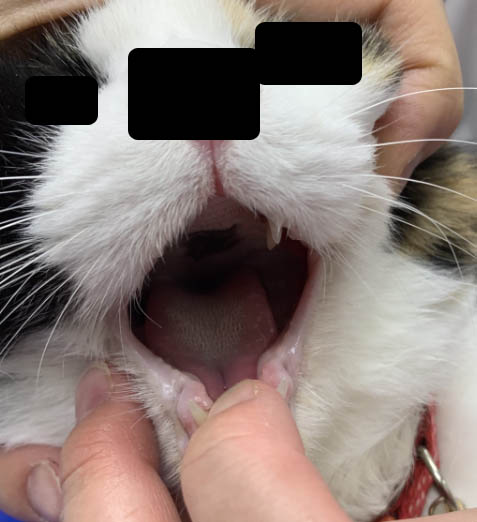 食べにくそうにしているということで、口内炎の存在を疑ったが、口が半開きになっているため、呼吸器に障害があるのかを精査するために開口して口腔内を観察した。