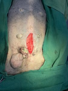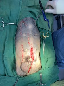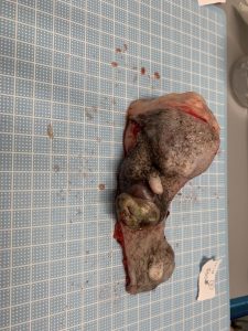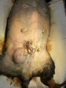 症例は恒例の未避妊メスのダックスであった。数カ月前から、下腹部にしこりがあることは知っていたが、年齢的に経過を観察していた。