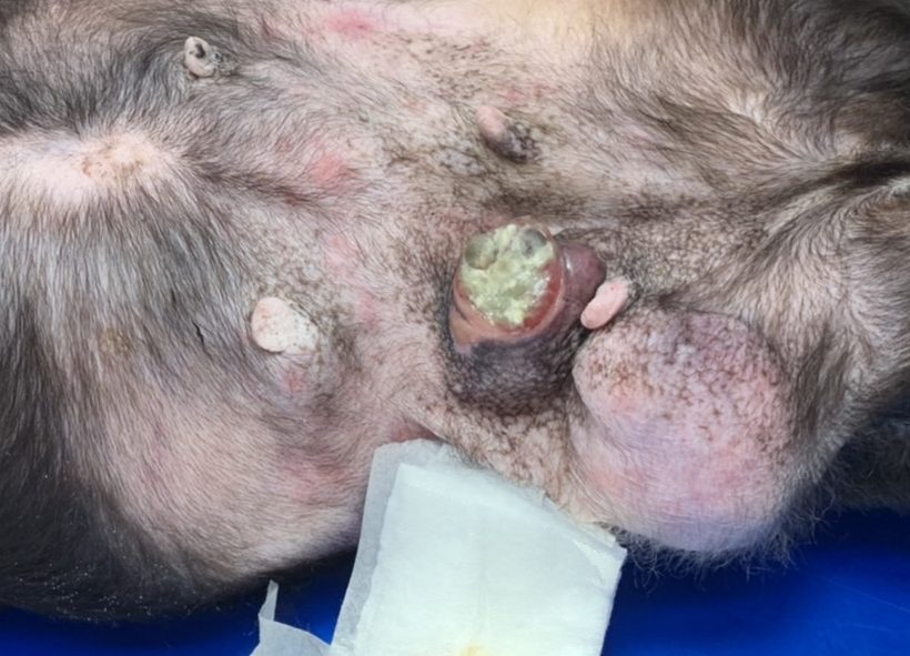 今月に入ってから、しこりが急速に拡大し、自壊し始めてしまったということで来院された。
