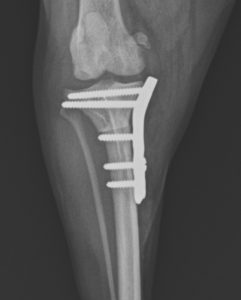 続けてTPLOへ移行し、ラウンドソーを用いて脛骨を予定の位置で骨切りしました。その後、脛骨高平部を適切な角度に回転させ、専用のTPLOプレートを用いてしっかりと固定しました。最後に関節包、皮下組織、皮膚を順に閉鎖し、手術を終了しました。